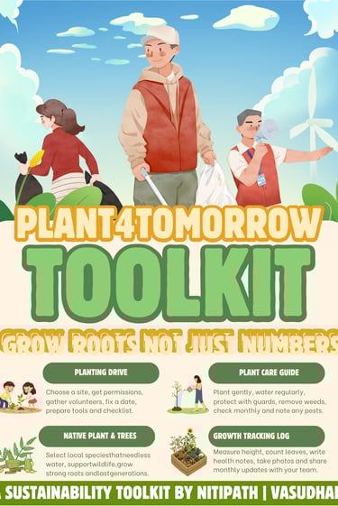 OUR TOOLKIT TURNS TREE PLANTING OR A CLEANLINESS DRIVE A GUIDED, COMMUNITY‑LED JOURNEY — COVERING PLANNING, SELECTION, PLANTING METHODS, AND TRACKING SURVIVAL RATES FOR REAL IMPACT.